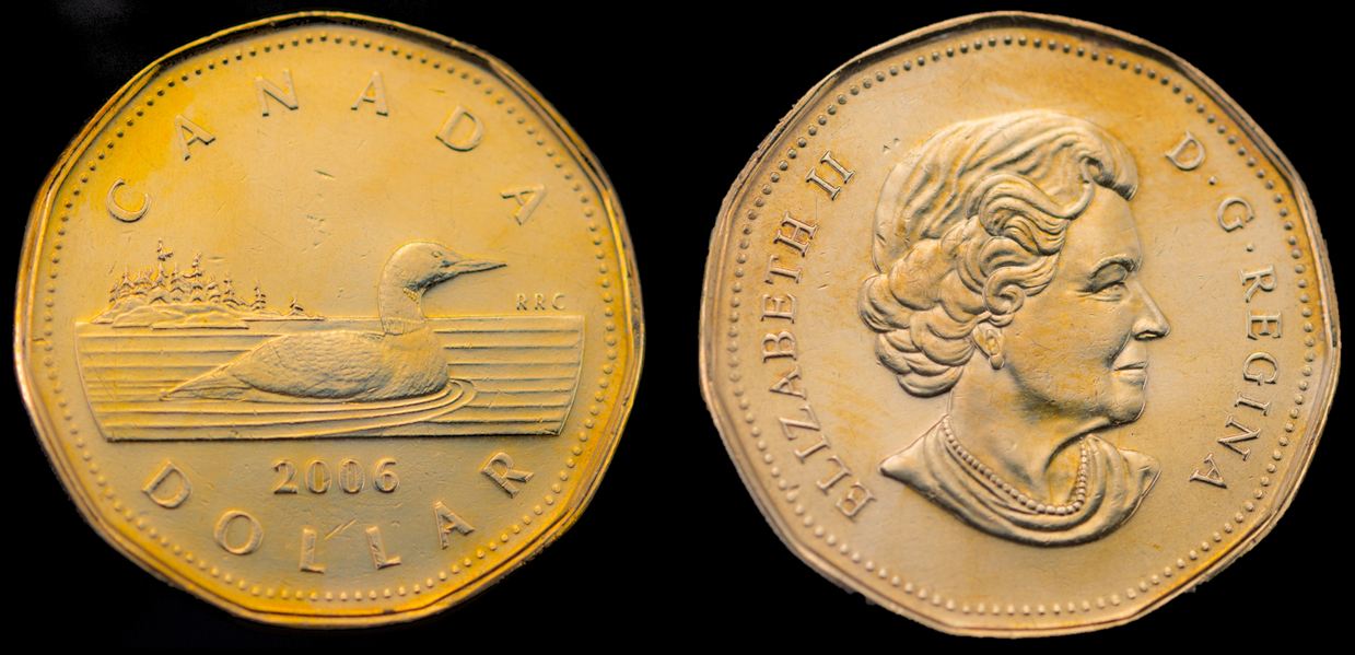 Moeda de 1 dólar – Chamada de Loonie a moeda é dourada e não é redonda, tem onze lados. Apresenta no reverso o Common Loon
