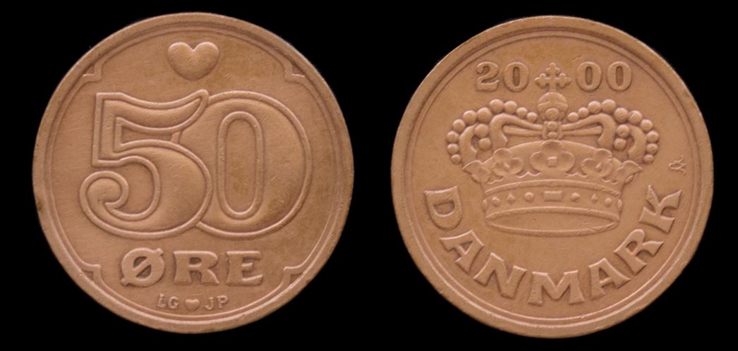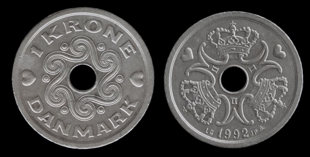 A moeda corrente na Dinamarca é a Coroa dinamarquesa, ou Krone em dinamarquês, os centavos são chamados de Ore. É também a moeda corrente da Groenlândia. Muitas das moedas apresentam um furo no centro.