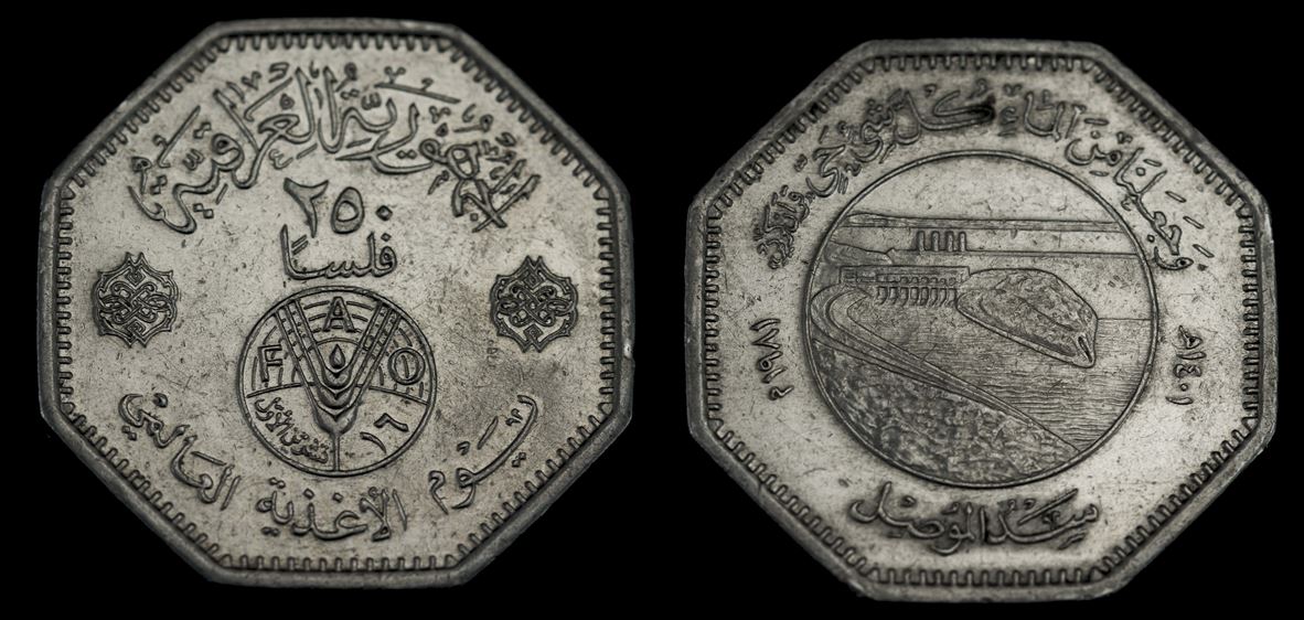 A moeda oficial do Iraque é o Dinar iraquiano. Subdivide-se em fils. Em 1981 foi lançada uma moeda de 250 fils comemorativa da FAO.