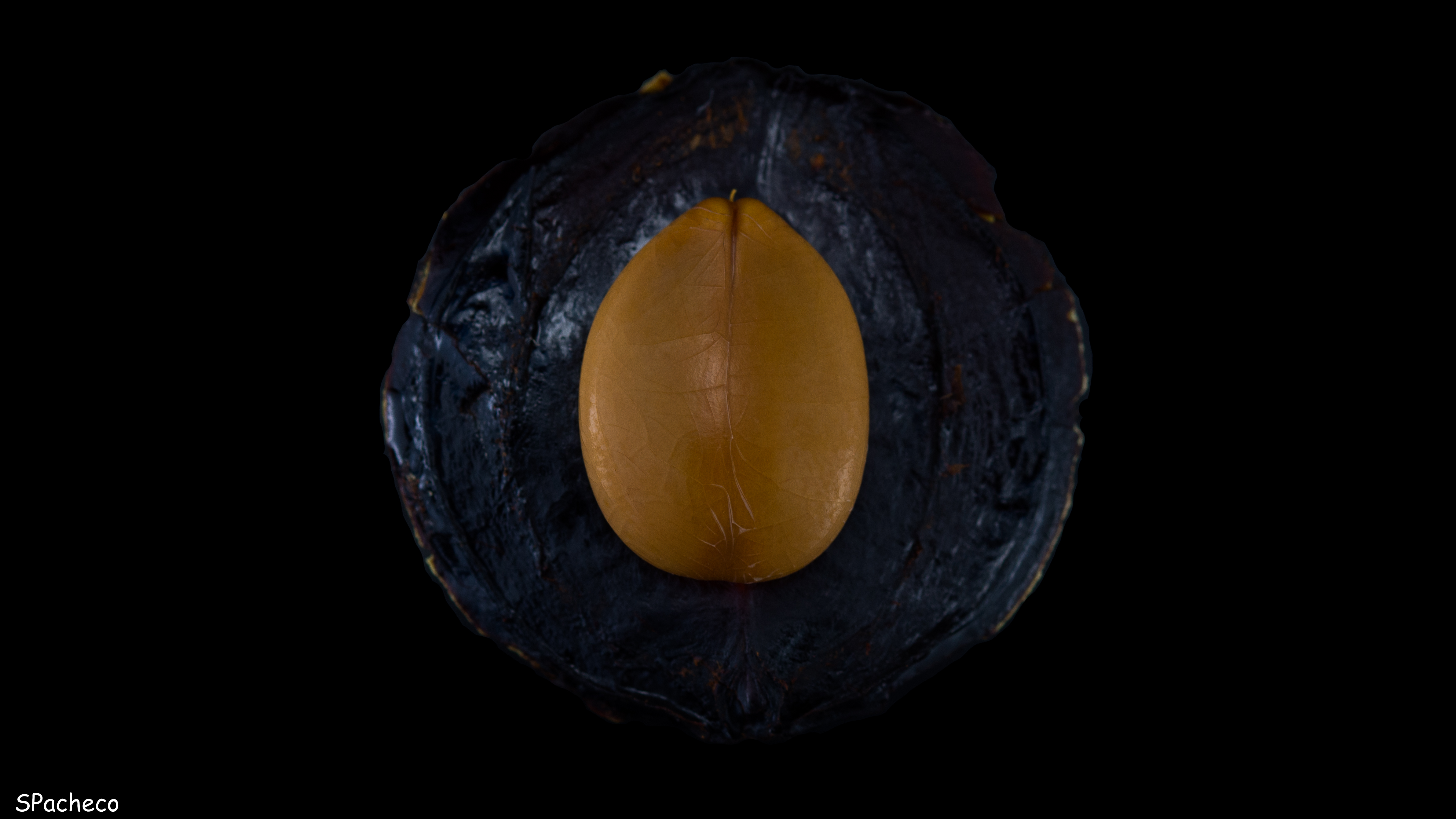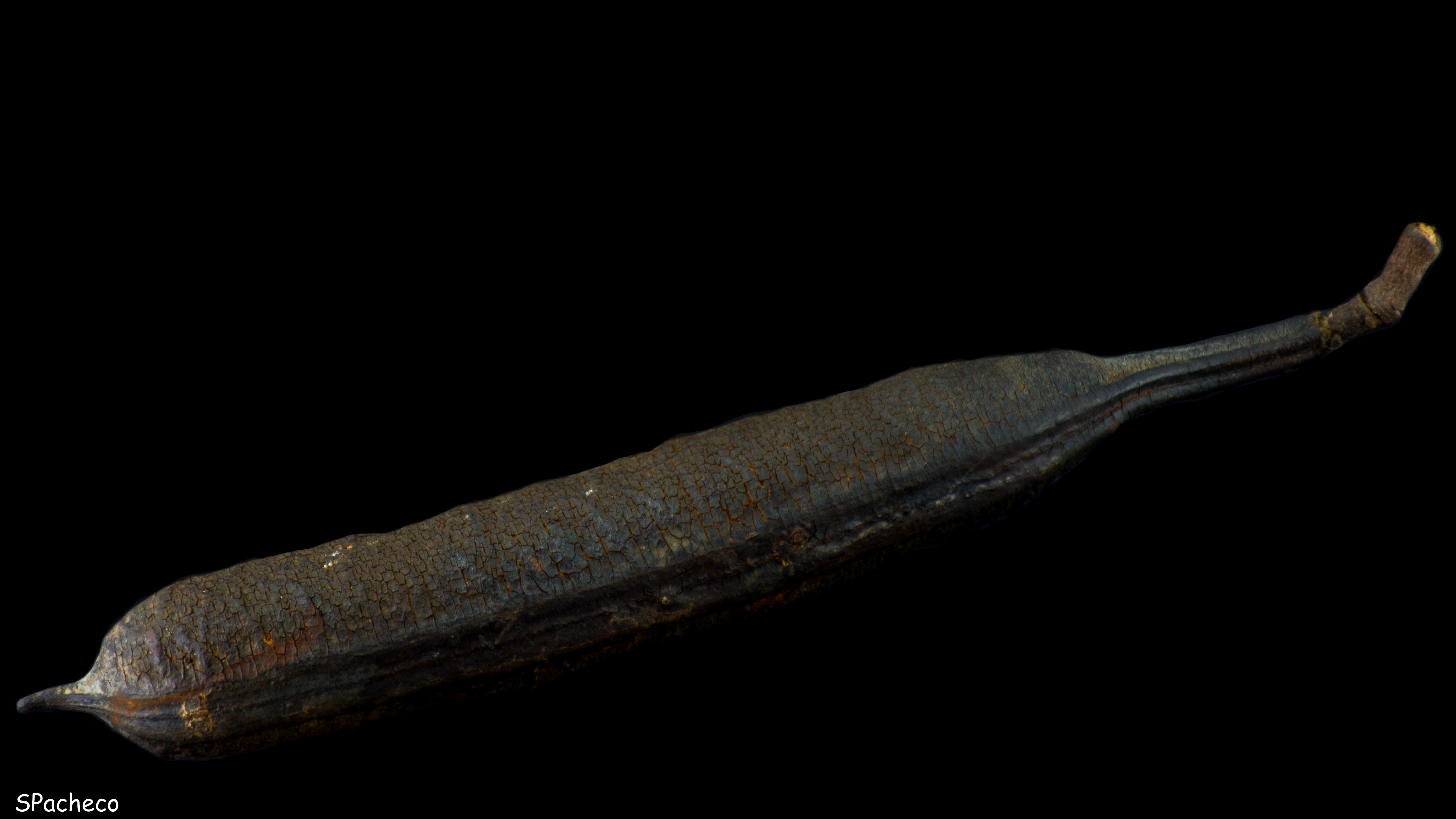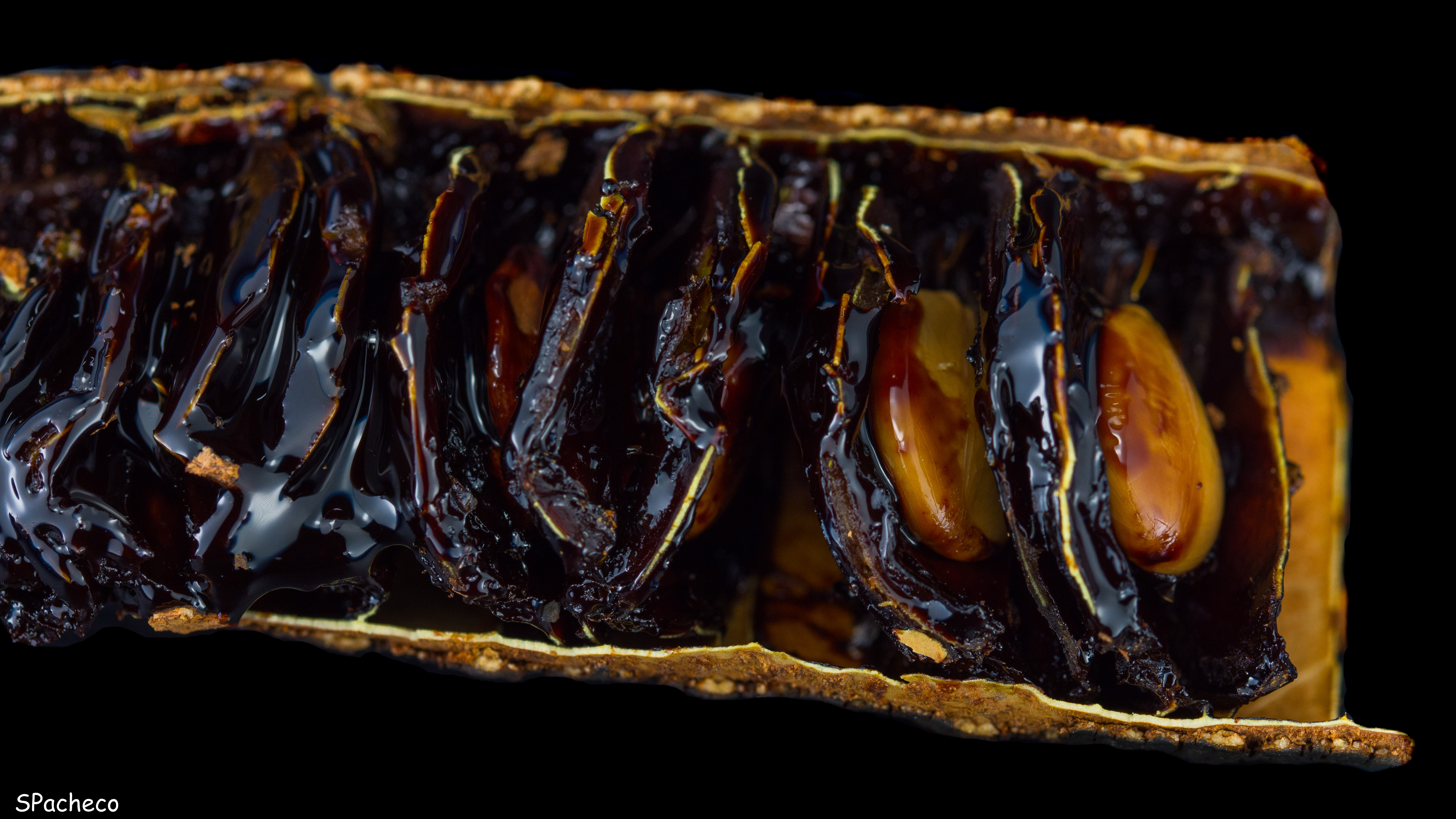 Os frutos são grandes vagens escuras e lenhosas divididas em seções que contém as sementes envoltas por um material escuro gelatinoso muito mal cheiroso. |